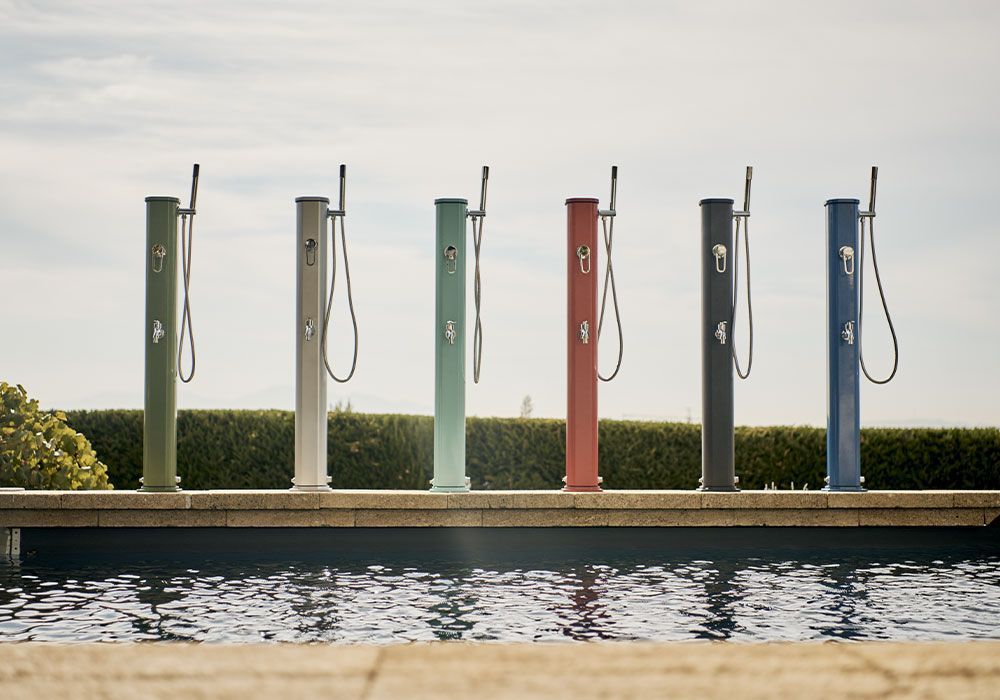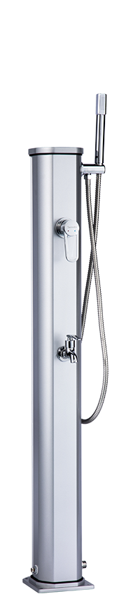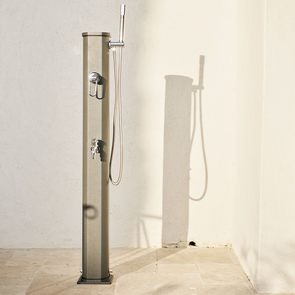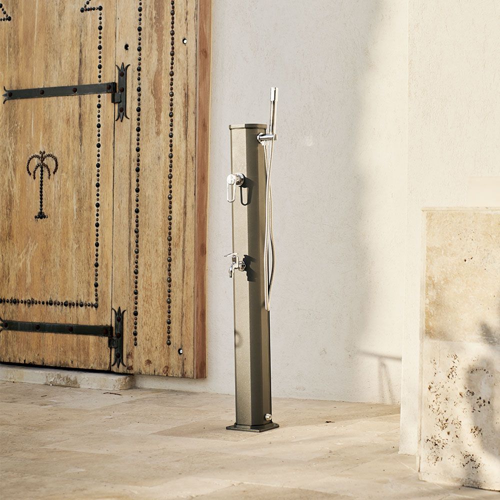 La Jolly Go séduira ceux qui recherchent une douche solaire discrète alliant capacité, praticité et design. Son corps en aluminium thermolaqué, disponible en deux coloris, intègre un mitigeur et une douchette amovible pour se rincer facilement le corps sans mouiller les cheveux.