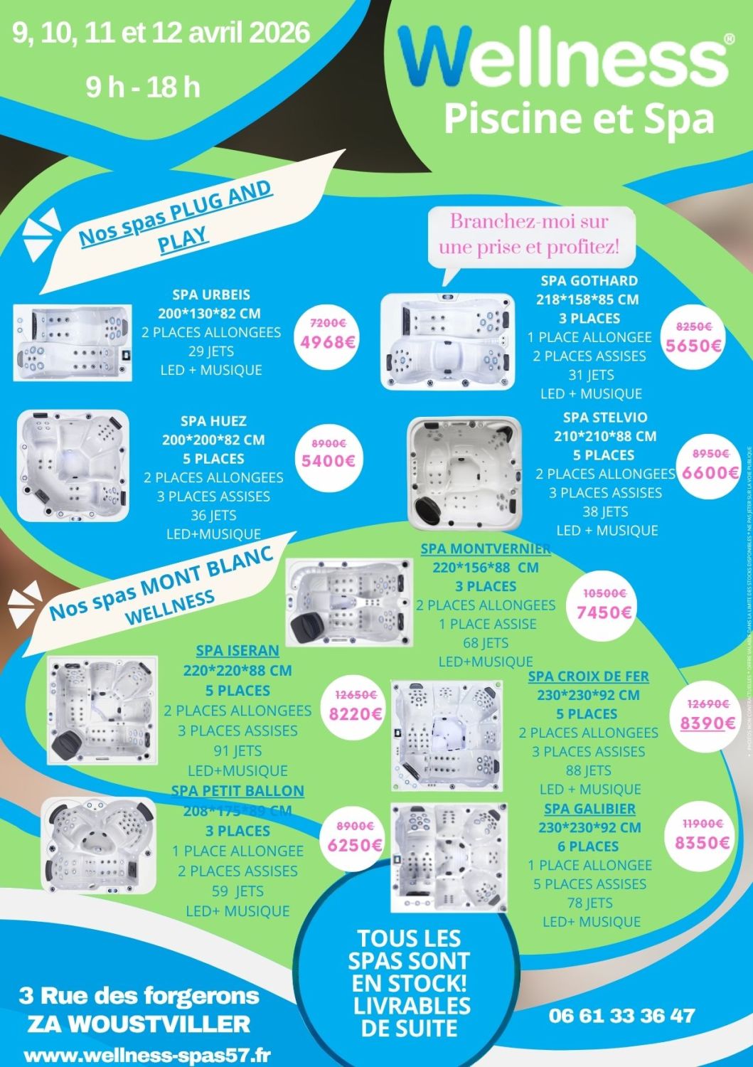 C'est la grande nouveauté de cet événement : tous les spas présentés sont disponibles en stock et livrables immédiatement. Pas besoin d'attendre des semaines, votre spa peut être chez vous dès la semaine suivante.