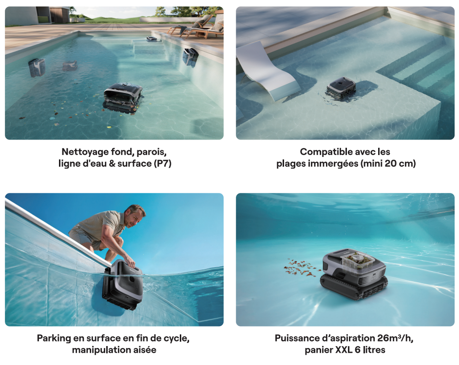 Nettoyage complet 3-en-1 : assure un entretien impeccable du fond, des parois et de la ligne d'eau en toute autonomie.